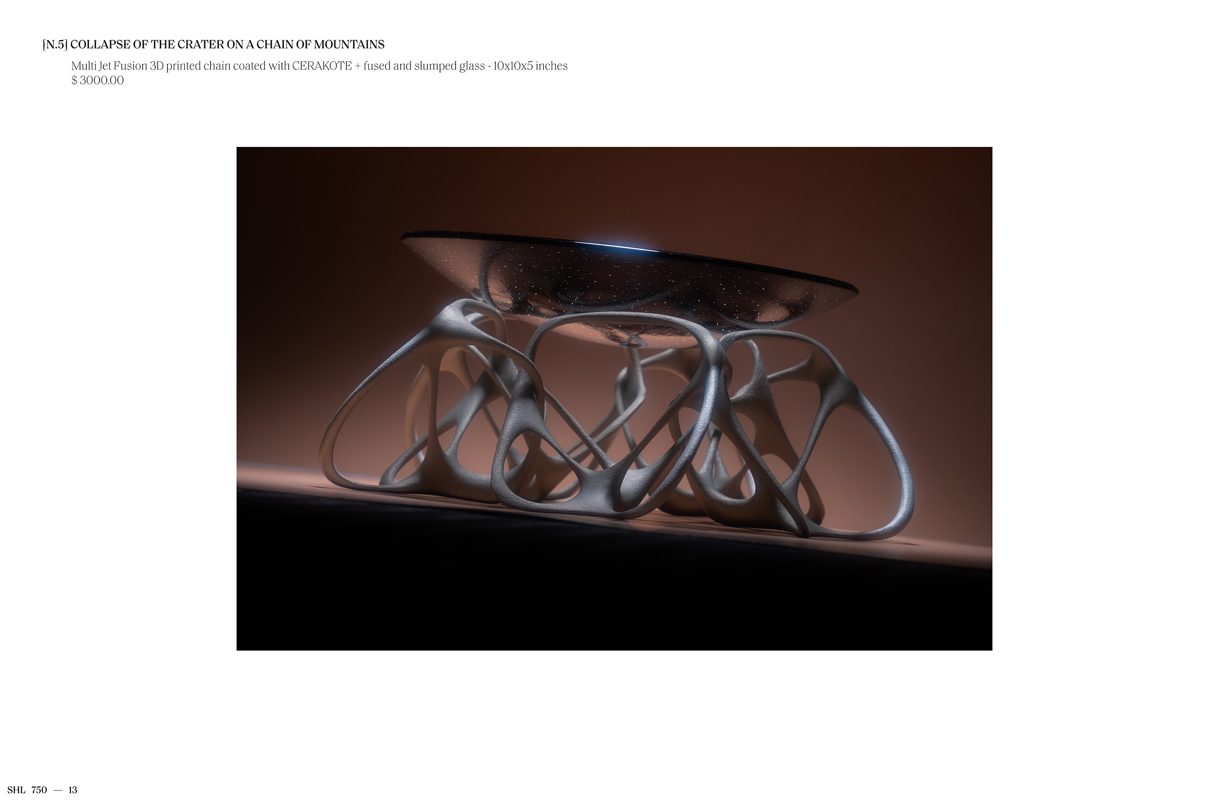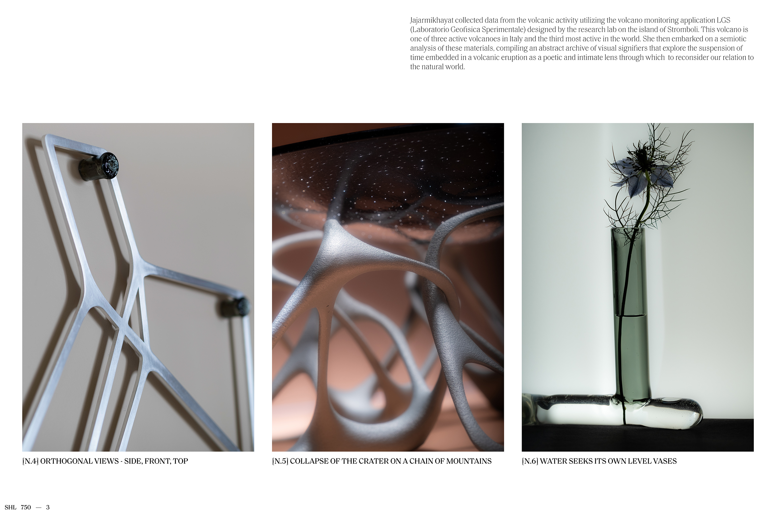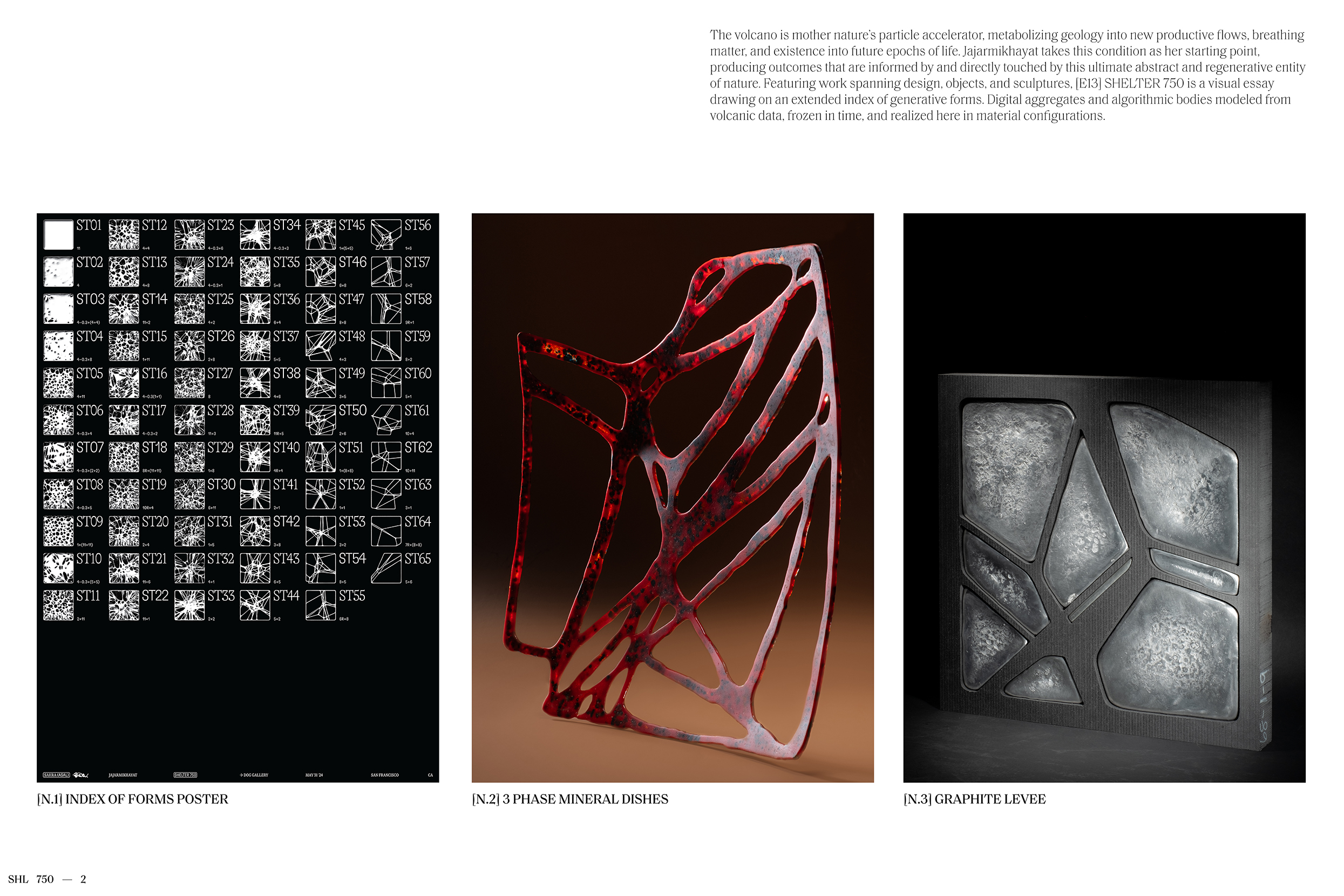 Featuring work spanning design, objects, and sculptures, [E13] SHELTER 750 is a visual essay drawing on an extended index of generative forms. Digital aggregates and algorithmic bodies modeled from volcanic data, frozen in time, and realized here in material configurations.