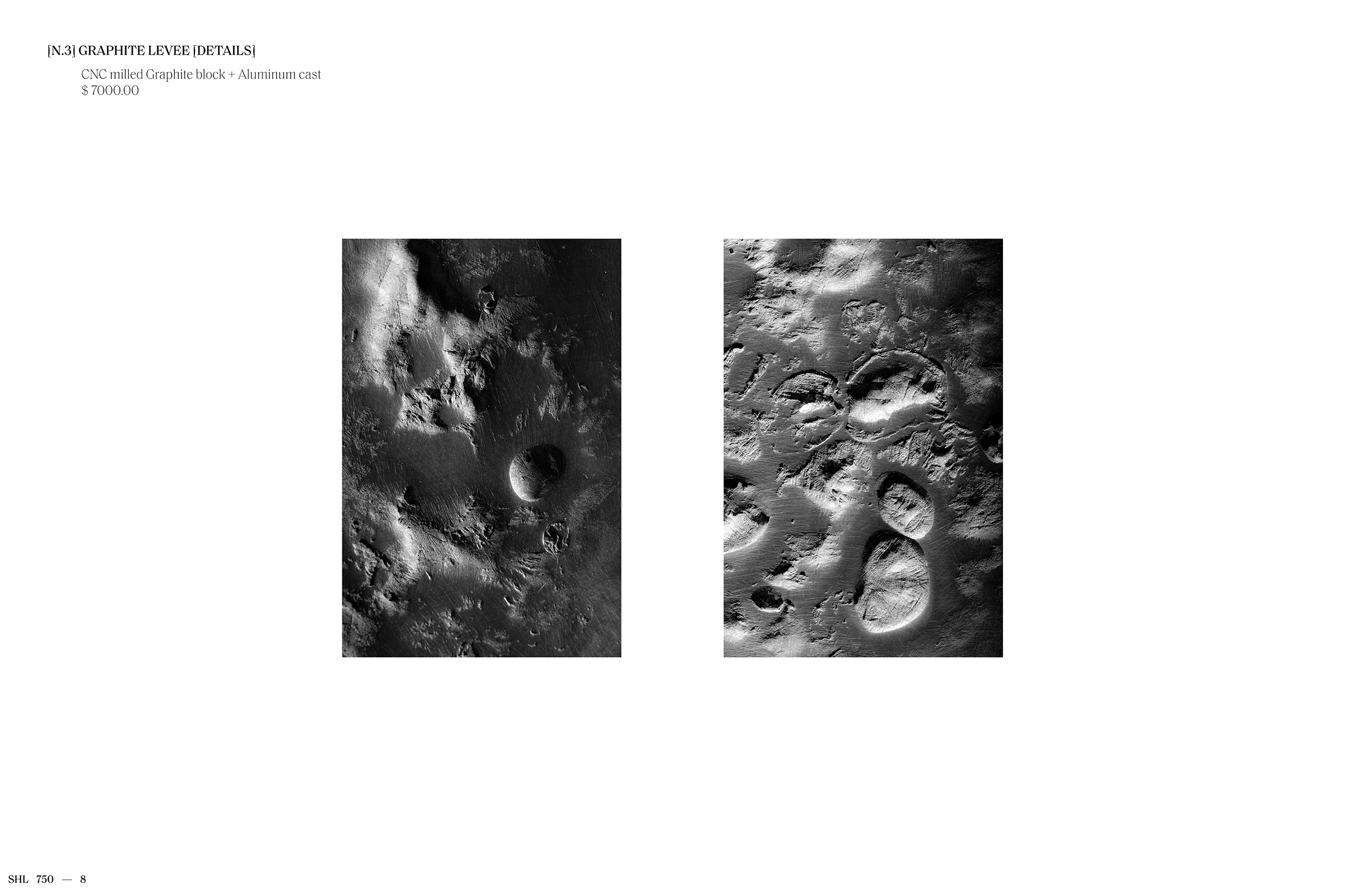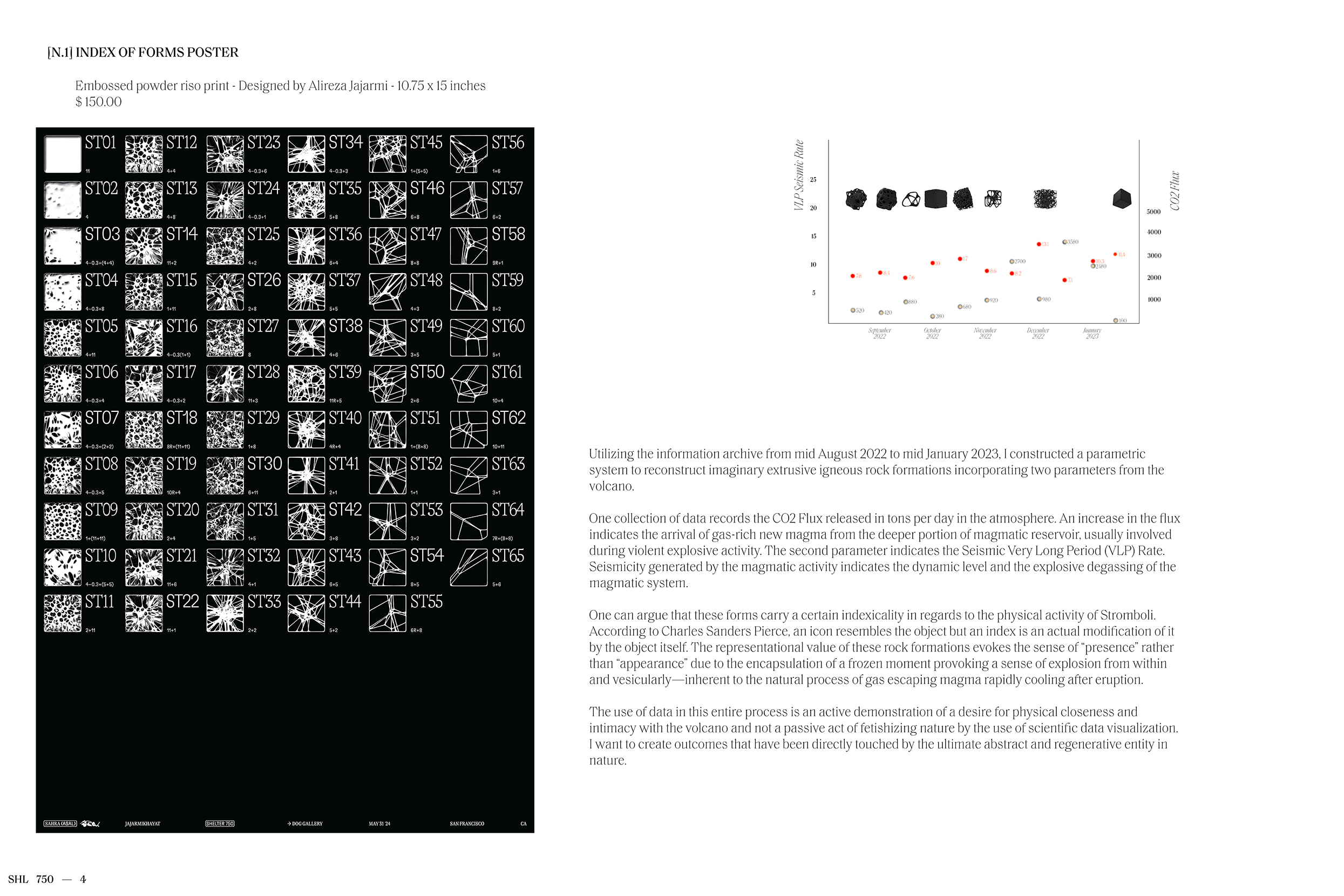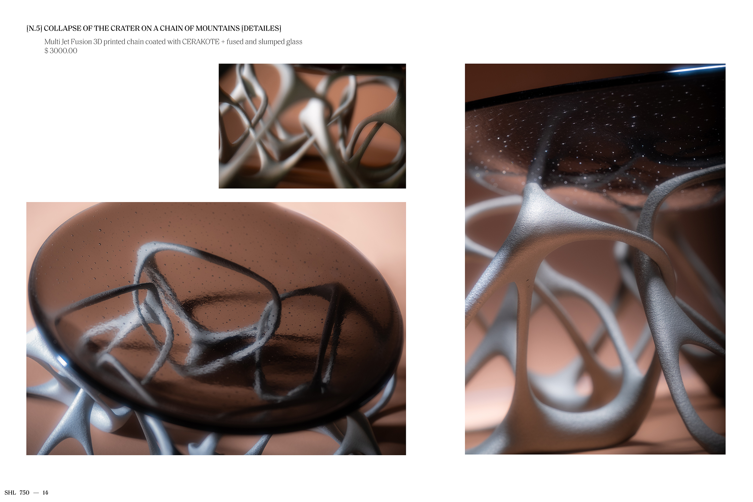 Featuring work spanning design, objects, and sculptures, [E13] SHELTER 750 is a visual essay drawing on an extended index of generative forms. Digital aggregates and algorithmic bodies modeled from volcanic data, frozen in time, and realized here in material configurations.