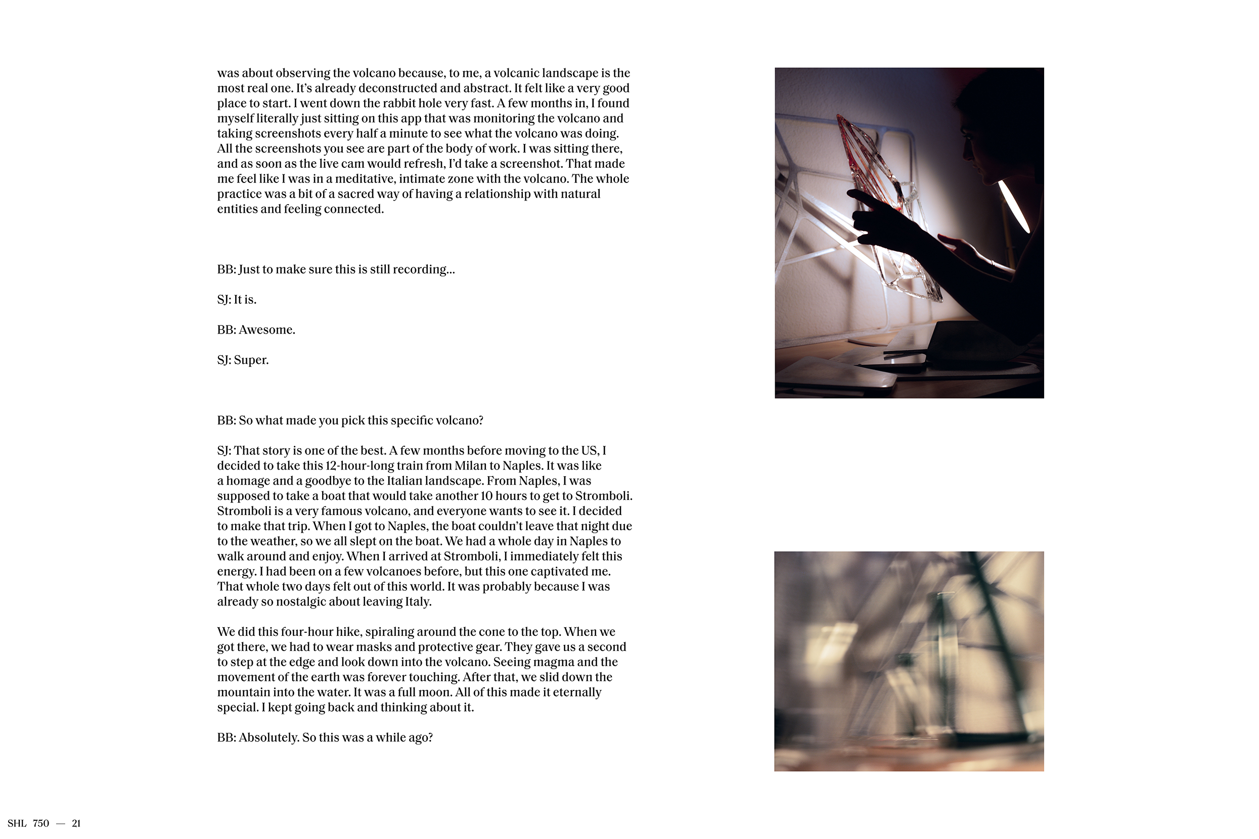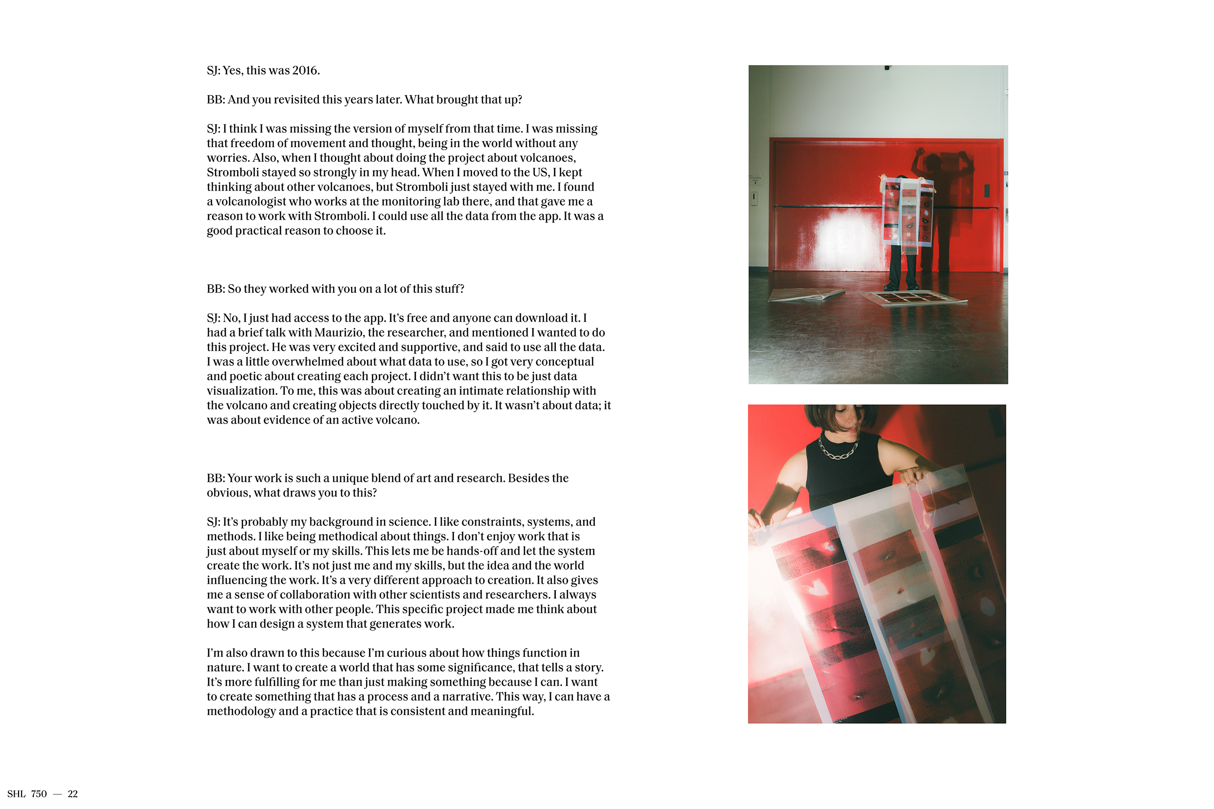 Jajarmikhayat collected data from the volcanic activity utilizing the volcano monitoring application LGS (Laboratorio Geofisica Sperimentale) designed by the research lab on the island of Stromboli. This volcano is one of three active volcanoes in Italy and the third most active in the world. She then embarked on a semiotic analysis of these materials, compiling an abstract archive of visual signifiers that explore the suspension of time embedded in a volcanic eruption as a poetic and intimate lens through which to reconsider our relation to the natural world.